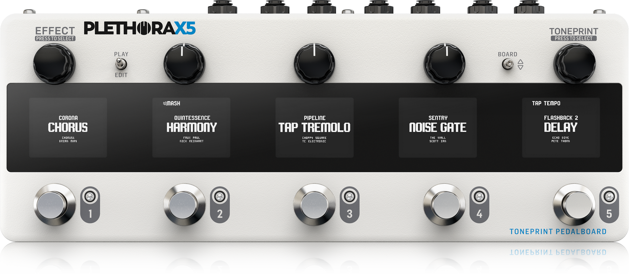 TonePrint Treasure Chest Each pedal in Plethora X5 has 75 TonePrint slots available for quick recall of your favorite settings, letting you collate and store a list of your favorite sounds for safe keeping. Dial in and store a cornucopia of unique TonePrints tailor-made to your personal gear setup and have a whole host of iconic tones ready for your next jam session made by the greatest musicians in the world!