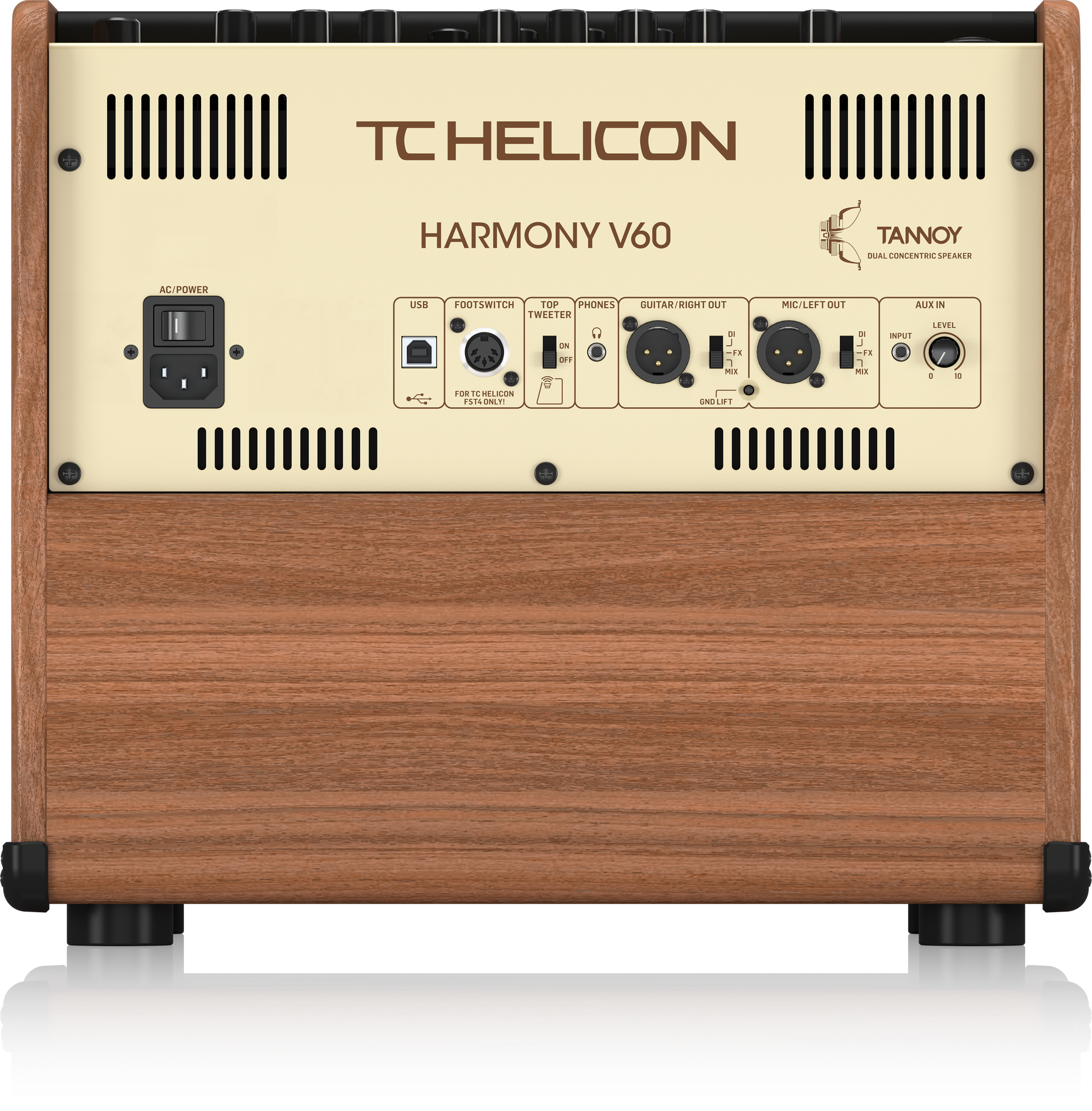 Hear yourself better When you turn on Harmony V60’s additional top-firing tweeter, an exclusive innovation from TC Helicon, you’ll finally get to hear more of what your audience hears. No more muffled sound or putting the amp on a chair, now you get an exciting sound standing beside, in front or behind your Harmony V60.