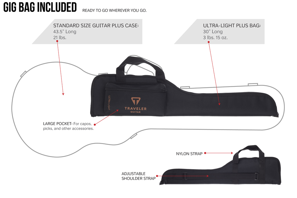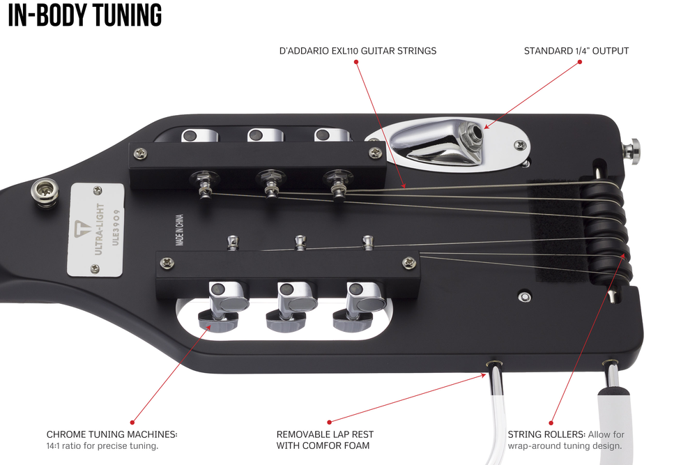The Ultra-Light is the smallest, lightest, full-scale travel guitar on the market. The proprietary In-Body Tuning System uses standard tuning machines relocated into the body, eliminating the need for a headstock. You get the same full-scale playing experience you’re used to on an instrument that’s substantially shorter and lighter than a typical full-size electric.